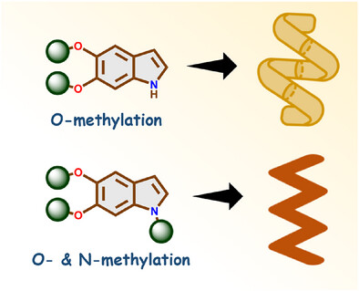 Eumelanin is a bio-pigment with remarkable photoprotective properties, whose function is tied to its complex supramolecular organization. Although hydrogen bonding and π–π interactions are recognized as key forces in shaping its architecture, their individual contributions remain poorly defined. Among its molecular precursors, the canonical monomer 5,6-dihydroxyindole (DHI) is notable for forming extensive hydrogen-bonded networks that stabilize supramolecular assemblies. To clarify how hydrogen bonding influences supramolecular topology in eumelanin precursors, we investigate selectively methylated derivatives of DHI, examining how subtle modifications to hydrogen-bonding motifs alter crystal packing, intermolecular arrangements, and optical properties. Single-crystal structures reveal that O-methylation (DMI) changes hydrogen-bonding dimensionality yet preserves helical assemblies, whereas full O- and N-methylation (DMI-Me) suppresses hydrogen-bonding, giving rise to zigzag arrangements dominated by van der Waals forces. Solid- and solution-state NMR measurements independently confirm the differences in the hydrogen-bonded assemblies. Complementary electronic spectroscopy shows that noncovalent architectures of the eumelanin derivatives exhibit pronounced excitonic coupling between neighboring chromophores. Electronic structure calculations support these observations, demonstrating that coupling originates primarily from Coulombic interactions, with minimal contributions from charge transfer. By linking molecular substitution to packing motifs and excitonic interactions, this work establishes hydrogen bonding as a design element for directing supramolecular order and emergent optoelectronic behavior in eumelanin-inspired materials.