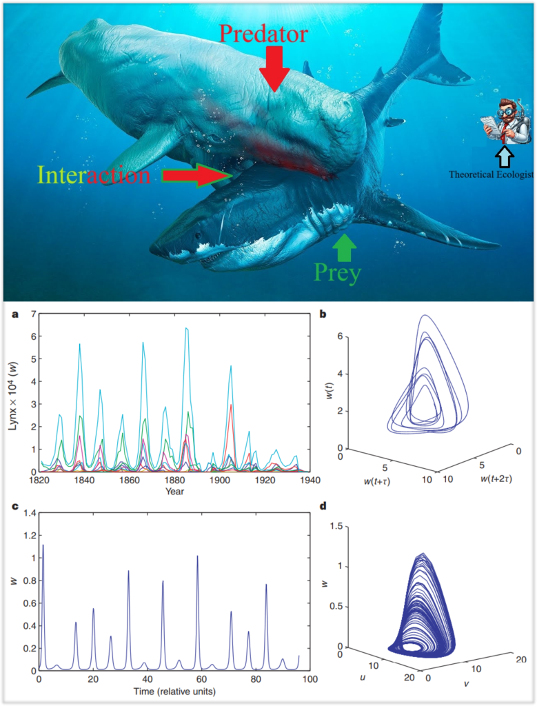 Population ecology is a cornerstone of computational biology and theoretical ecology, dealing with the biodiversity and persistence of an ecosystem primarily through the lens of spatio-temporal species population dynamics. Specific essential parameters, particular to the ecosystem in question, govern the population dynamics of an ecosystem and thus majorly influence the extinction risk of ecosystems. Such parameters quantify biotic and abiotic phenomena like the death rate of a species, the birth rate of a species, immigration, emigration, trophic and non-trophic interspecies and intraspecies interactions, as well as eco-environmental interactions, like climate change, habitat loss, and human influence. Factoring in these parameters, the population dynamics of ecosystems are described by prey-predator models, which are essentially nonlinear and can be analyzed using the robust structure of nonlinear dynamics. This fundamentally ‘physical’ approach to theoretical ecology has resulted in several remarkable observations and predictions (e.g., Figure 1. From Blasius and Stone, 1991). Not only do these models exhibit features of traditional nonlinear dynamics like chaoticity, but we can extend them readily to construct complex networks of food -webs ( i.e., multi-species oscillator models), which accurately describe the intricacies of a natural ecosystem. We live in ecosystems, and understanding what keeps them alive is what keeps us alive, and NLD can help us keep it that way.